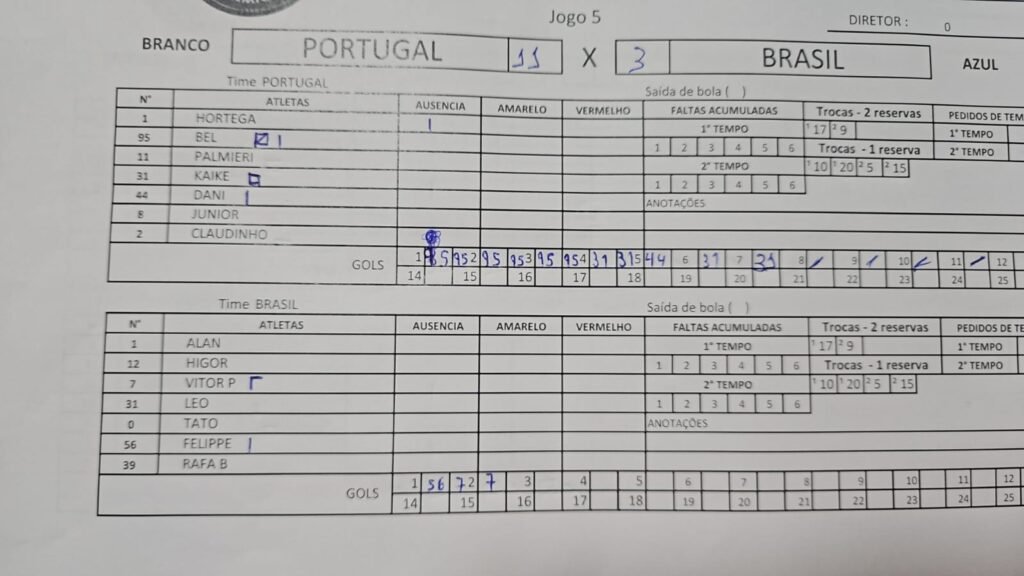 (BRANCO) Portugal vs Brasil (AZUL) 11 vs 3 ResultadosClubeGolsResultadoPortugal11VitBrasil3Der Portugal ClaudinhoKayke Junior1Raphael Hortega 11Palmieri44Dani 95Bel Brasil HigorRafael BezerraTatoAlan 22Victor P. 31Leo Bertolaci56Felippe Pardinho Rever Detalhes Data Tempo Liga Temporada Rodada abril 29, 2025 8:30 pm Liga Amigos 1980 2025-03 Rodada 3 Campo Quadra Veleiros