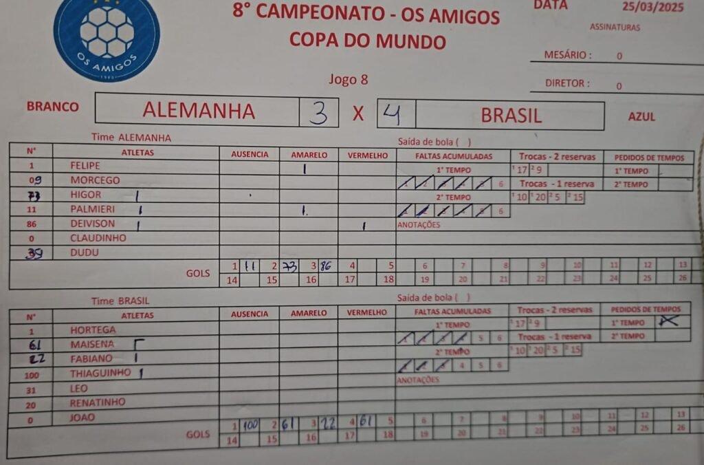 (BRANCO) Alemanha vs Brasil (AZUL) 3 vs 4 ResultadosClubeGolsResultadoAlemanha3DerBrasil4Vit Alemanha Higor ClaudinhoRaphael PardinhoDudu01Felipe 11Palmieri 86Deivison Brasil Maisena JoãoFabiano Juscelino1Raphael Hortega 20Renatinho31Leo Bertolaci100Thiaguinho Rever Detalhes Data Tempo Liga Temporada Rodada março 25, 2025 9:30 pm Liga Amigos 1980 2025-02 Rodada 4 Campo Quadra Veleiros