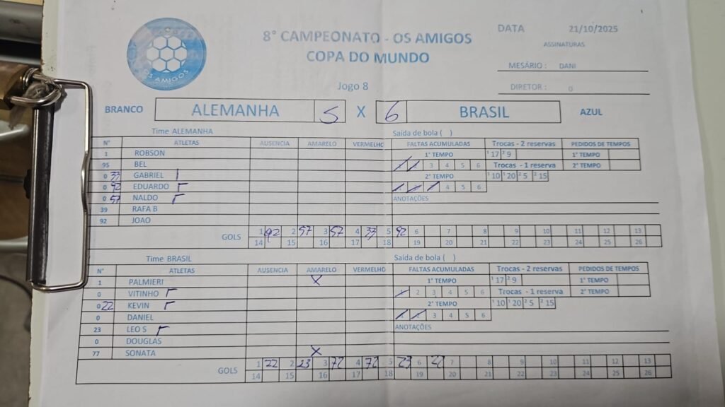 Alemanha (BRANCO) vs Brasil (AZUL) 5 vs 6 ResultadosClubeGolsResultadoAlemanha5DerBrasil6Vit Alemanha Rafael BezerraJoãoNaldo Marcelo JapaEduardo 01Robson 95BelGabriel Brasil DanielVitinho DouglasKevin 11Palmieri 23Leo S. 77Sonata Rever Detalhes Data Tempo Liga Temporada Rodada Mesário outubro 21, 2025 9:30 pm Liga Amigos 1980 2025-07 Rodada 4 Dani Campo Quadra Veleiros