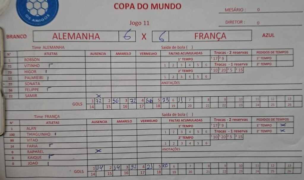 (BRANCO) Alemanha vs França (AZUL) 6 vs 6 ResultadosClubeGolsResultadoAlemanha6EmpFrança6Emp Alemanha Higor Vitinho 01Robson 11Palmieri 22Samir 56Felippe Pardinho 77Sonata França João Kaique Raphael Alan 14Rafael Faria 99Vitão (Victor Silva)100Thiaguinho Rever Detalhes Data Tempo Liga Temporada Rodada dezembro 10, 2024 8:30 pm Liga Amigos 1980 2024-07 Rodada 6 Campo Quadra Veleiros