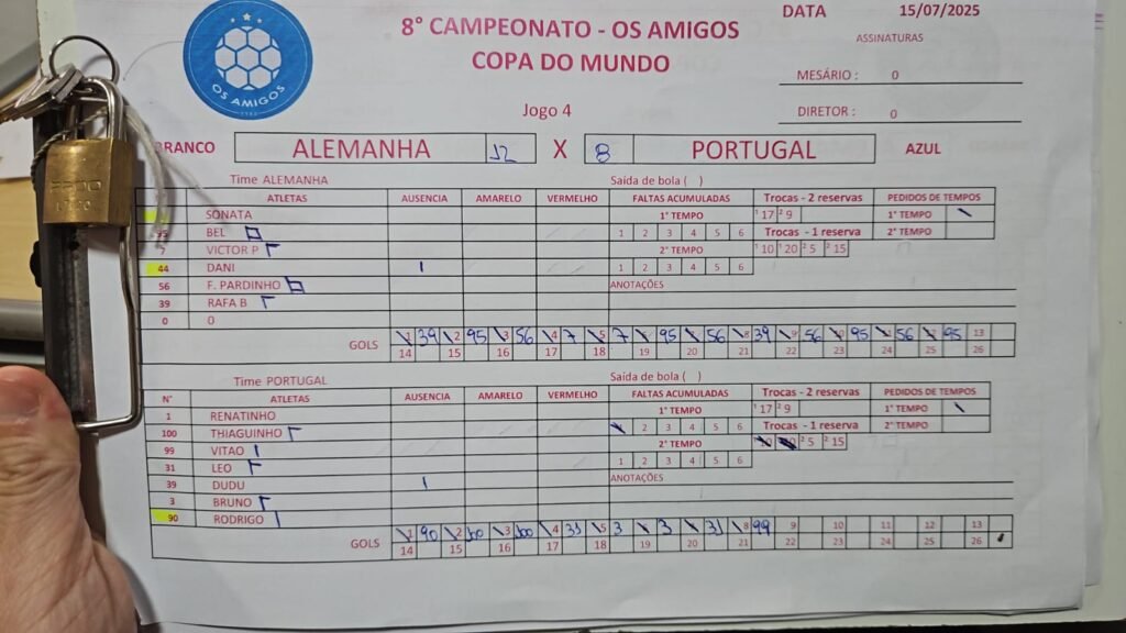 Alemanha (BRANCO) vs Portugal (AZUL) 12 vs 8 ResultadosClubeGolsResultadoAlemanha12VitPortugal8Der Alemanha Rafael Bezerra 22Victor P. 44Dani 56Felippe Pardinho 77Sonata 95Bel Portugal Rodrigo Dudu Bruno 20Renatinho 31Leo Bertolaci 99Vitão (Victor Silva) 100Thiaguinho Rever Detalhes Data Tempo Liga Temporada Rodada julho 15, 2025 9:30 pm Liga Amigos 1980 2025-05 Rodada 2 Campo Quadra Veleiros