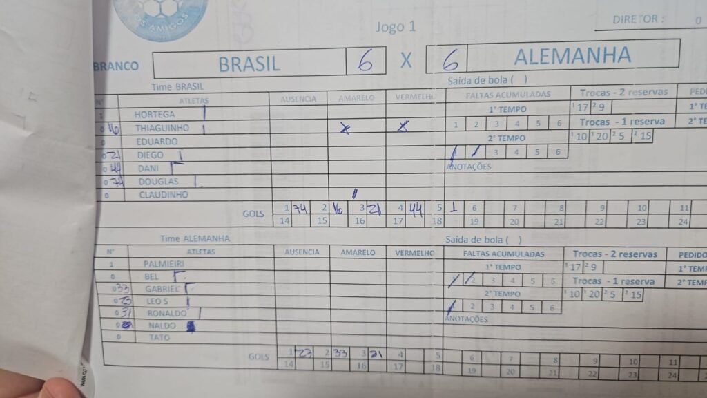 Brasil (BRANCO) vs Alemanha (AZUL) 6 vs 6 ResultadosClubeGolsResultadoBrasil6EmpAlemanha6Emp Brasil Diego Claudinho Douglas Eduardo1Raphael Hortega 44Dani 100Thiaguinho Alemanha TatoNaldoGabriel Ronaldo 11Palmieri 23Leo S. 95Bel Rever Detalhes Data Tempo Liga Temporada Rodada novembro 11, 2025 8:30 pm Liga Amigos 1980 2025-08 Rodada 1 Campo Quadra Veleiros