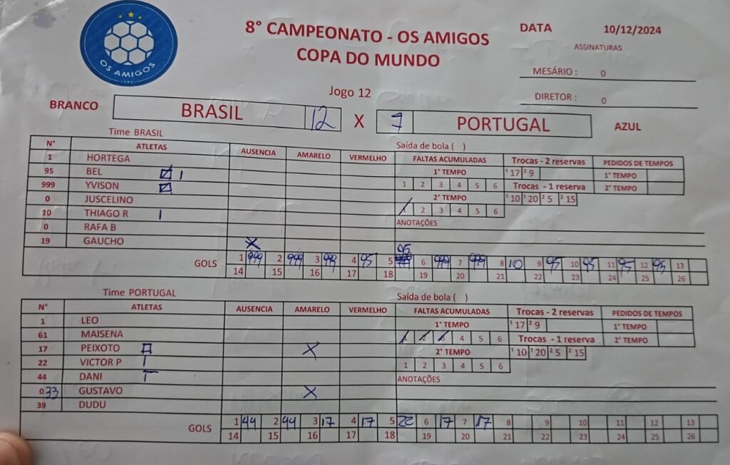 (BRANCO) Brasil vs Portugal (AZUL) 12 vs 7 ResultadosClubeGolsResultadoBrasil12VitPortugal7Der Brasil Rafael BezerraJuscelino1Raphael Hortega 10Thiago R. 19Gaúcho 74Yvison 95Bel Portugal MaisenaPeixoto Dudu20Renatinho22Victor P. 31Leo Bertolaci 44Dani Gustavo Rever Detalhes Data Tempo Liga Temporada Rodada dezembro 10, 2024 9:30 pm Liga Amigos 1980 2024-07 Rodada 6 Campo Quadra Veleiros