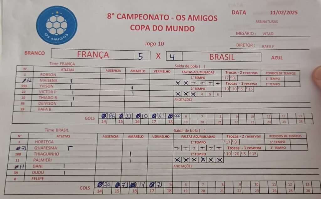 (BRANCO) França vs Brasil (AZUL) 5 vs 4 ResultadosClubeGolsResultadoFrança5VitBrasil4Der França Maisena RaphaelRafael Bezerra01Robson 10Thiago R. 22Victor P. 74Yvison 86Deivison Brasil Quaresma MarceloDudu 1Raphael Hortega 11Palmieri 44Dani 100Thiaguinho Rever Detalhes Data Tempo Liga Temporada Rodada fevereiro 11, 2025 9:30 pm Liga Amigos 1980 2025-01 Rodada 5 Campo Quadra Veleiros