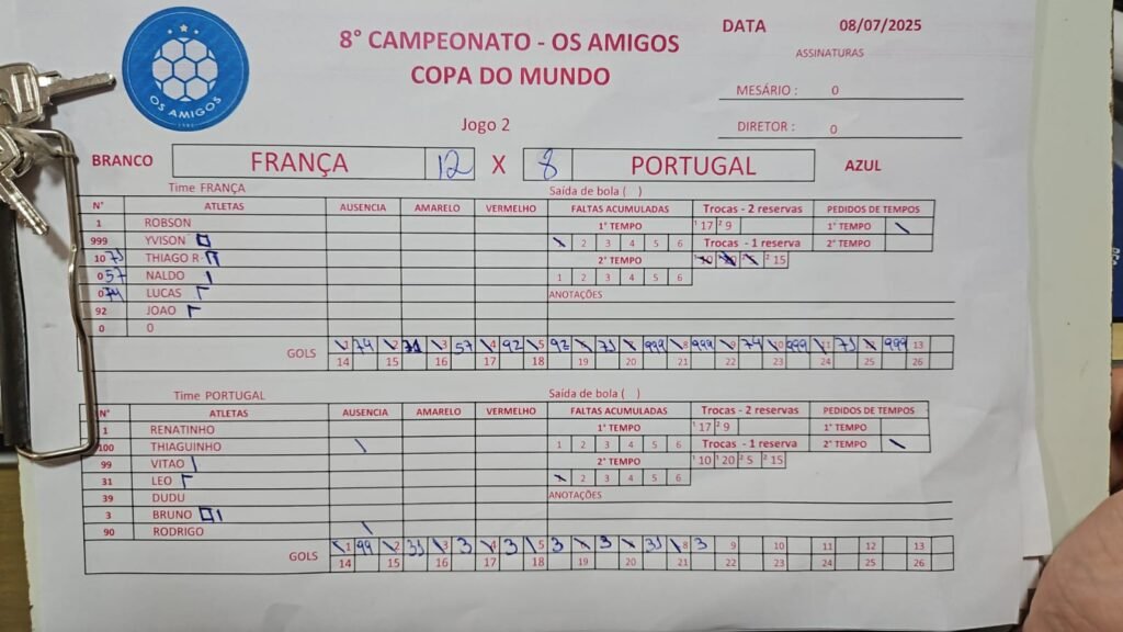 França (BRANCO) vs Portugal (AZUL) 12 vs 8 ResultadosClubeGolsResultadoFrança12VitPortugal8Der França João Naldo 01Robson 10Thiago R. 13Lucas 74Yvison Portugal Rodrigo DuduBruno 20Renatinho 31Leo Bertolaci 99Vitão (Victor Silva) 100Thiaguinho Rever Detalhes Data Tempo Liga Temporada Rodada julho 8, 2025 9:30 pm Liga Amigos 1980 2025-05 Rodada 1 Campo Quadra Veleiros