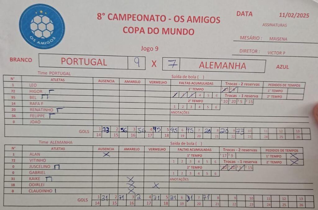 (BRANCO) Portugal vs Alemanha (AZUL) 9 vs 7 ResultadosClubeGolsResultadoPortugal9VitAlemanha7Der Portugal JoãoHigor 14Rafael Faria20Renatinho 31Leo Bertolaci 56Felippe Pardinho 99Vitão (Victor Silva)95Bel Alemanha VitinhoClaudinho Kayke Gabriel VieiraAlan Juscelino 18Odirlei 19Gaúcho77Sonata Rever Detalhes Data Tempo Liga Temporada Rodada fevereiro 11, 2025 8:30 pm Liga Amigos 1980 2025-01 Rodada 5 Campo Quadra Veleiros