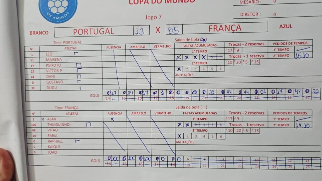 (BRANCO) Portugal vs França (AZUL) 13 vs 5 ResultadosClubeGolsResultadoPortugal13VitFrança5Der Portugal MaisenaPeixoto Dudu 20Renatinho22Victor P. 31Leo Bertolaci 44Dani Gustavo França JoãoKaiqueRaphael Alan 14Rafael Faria99Vitão (Victor Silva)100Thiaguinho Rever Detalhes Data Tempo Liga Temporada Rodada novembro 26, 2024 8:30 pm Liga Amigos 1980 2024-07 Rodada 4 Campo Quadra Veleiros