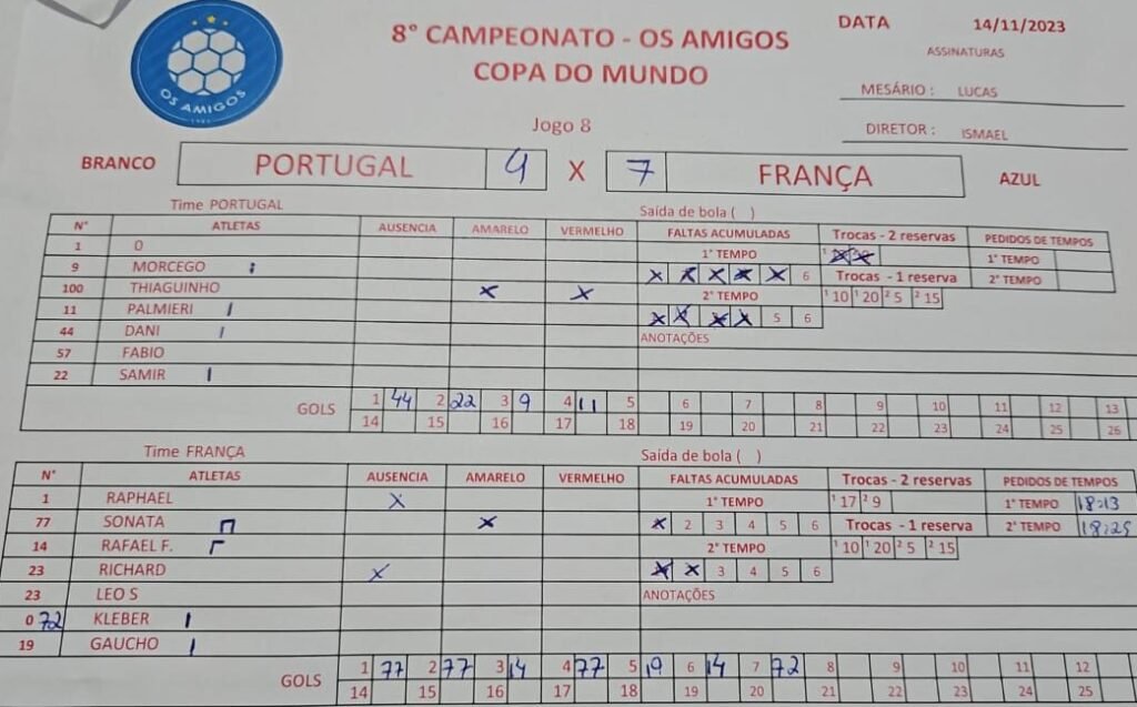 Portugal vs França 4 vs 7 ResultadosClubeGolsResultadoPortugal4DerFrança7Vit Portugal Goleiro0109Morcego (Gustavo) 11Palmieri 22Samir 44Dani 57Fábio100Thiaguinho França Kleber 14Rafael Faria 19Gaúcho 23Leo S.77Sonata Detalhes Data Tempo Liga Temporada Rodada novembro 14, 2023 9:30 pm Liga Amigos 1980 2023 Rodada 4 Campo Quadra Veleiros